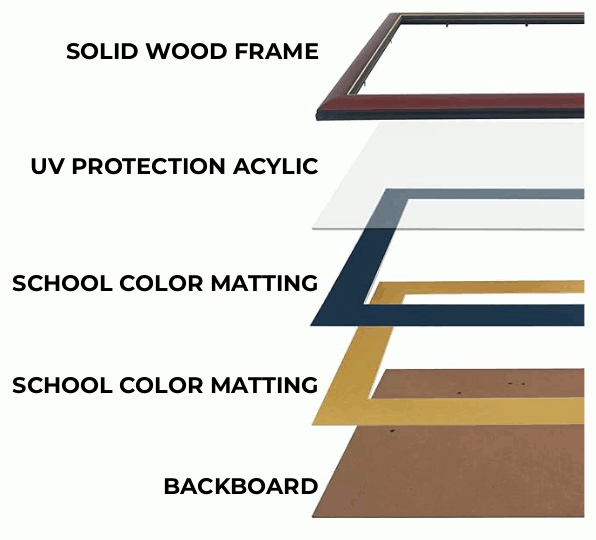 THIS FRAME IS CUSTOM CRAFTED TO FIT CERTIFICATES FROM [UNIVERSITY NAME]. THE SIZE OF THIS FRAME IS 16″ X 18″ AND IT ACCOMMODATES CURRENT DIPLOMAS SIZED 8-1/2″ X 11″.